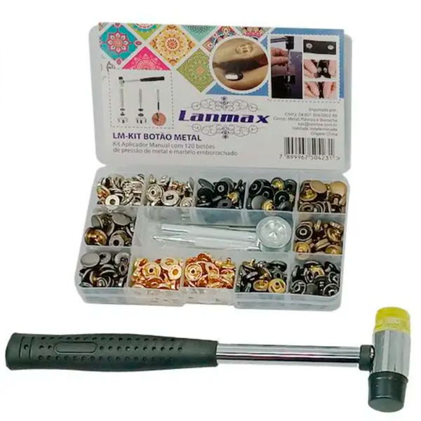 Kit aplicador manual com 120 botões de pressão de metal e martelo emborrachado.