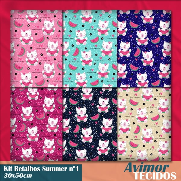 Um dos melhores kits dentro da nossa sessão de tecidos tricoline, sem dúvidas é o kit retalho tricoline summer 1 (30 x 50cm) com estampa de gatinho!